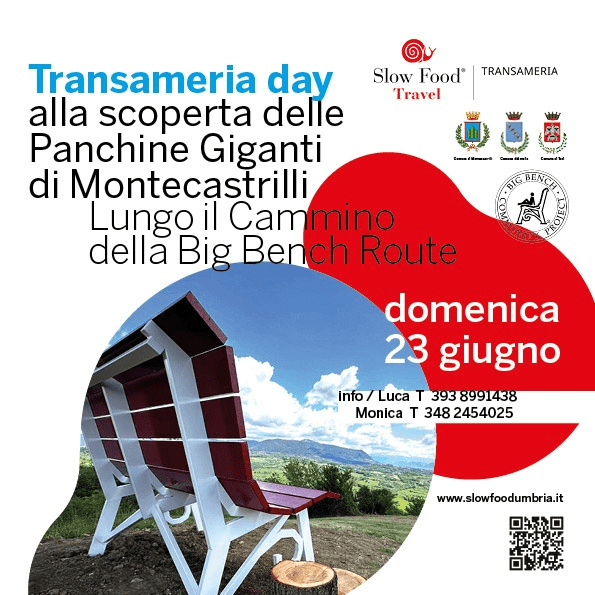 TERNI – Un appuntamento organizzato da Slow Food Umbria con la Comunità Slow Travel di Transameria all’insegna della natura, del cibo buono e pulito ma soprattutto della scoperta delle panchine giganti installate dal Comune di Montecastrilli sul suo splendido territorio. È l’evento “Transameria day” fissato per domenica 23 giugno, un cammino lento da fare a piedi o in bicicletta, con l’obiettivo di osservare e ammirare la Big Bench Route e degustare i vini e i prodotti locali del territorio.